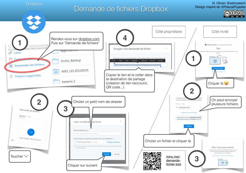 Dropbox sert à déposer des fichiers - comme Google Drive ou un autre cloud. L'avantage ici, c'est la demande de fichiers sans authentification : les élèves peuvent déposer des travaux/productions sans les partager aux autres élèves. Bémol : 2 Go seulement ...