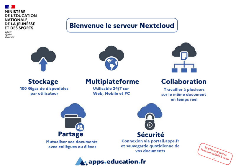 Dans Partage > Cloud académique (onglets à gauche juste au-dessus de "Fiche de paie" ) = Cloud national (100 Go, interface sécurisée via un portail d'authentification académique, possibilité de documents créés en ligne au format tableur, traitement de texte, présentations avec partage/droits de modifications).