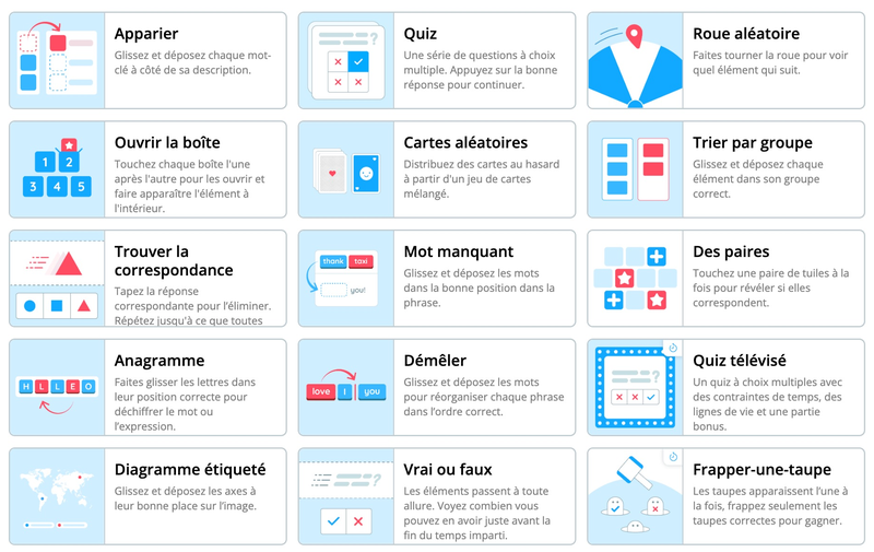 Wordwall est une plateforme en ligne qui permet de créer très simplement de petits exercices interactifs pour la classe. À l'image d'autres outils du même